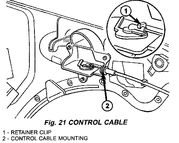 (9) Unlock retainer clip and disconnect control cable, (Fig. 21)