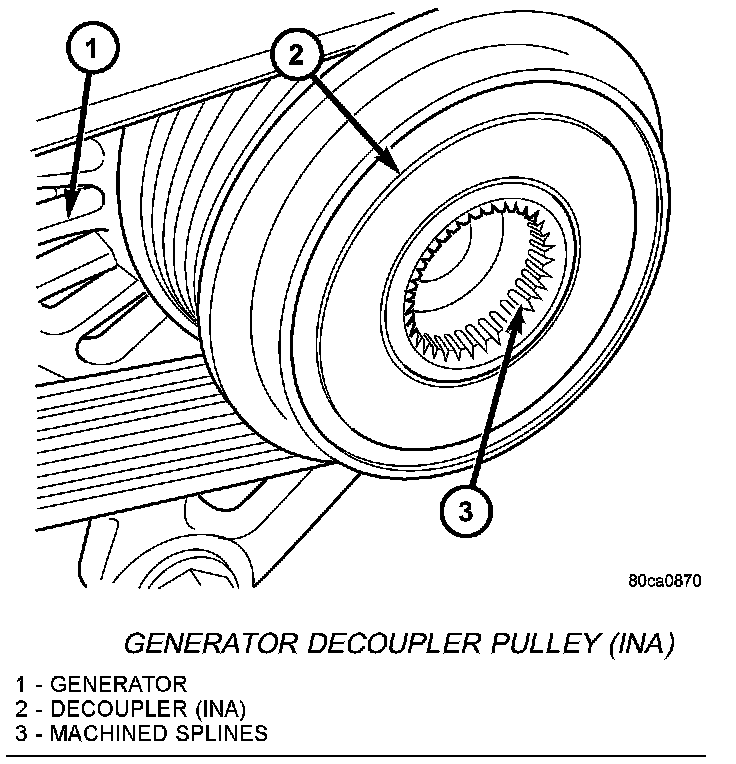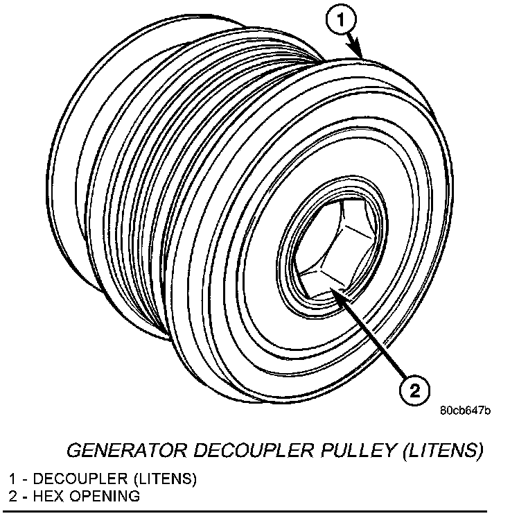 Two different type generator decoupler pulleys are used. One can be identified by the use of machined splines. The other can be identified by a hex opening and will not use splines.