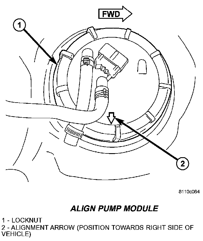 9. Both fuel line fittings should be pointed to the right side of the vehicle Rotate and position alignment arrow towards right side of vehicle (if necessary) before tightening locknut This step must be performed to prevent the module's float from contacting the side of fuel tank.