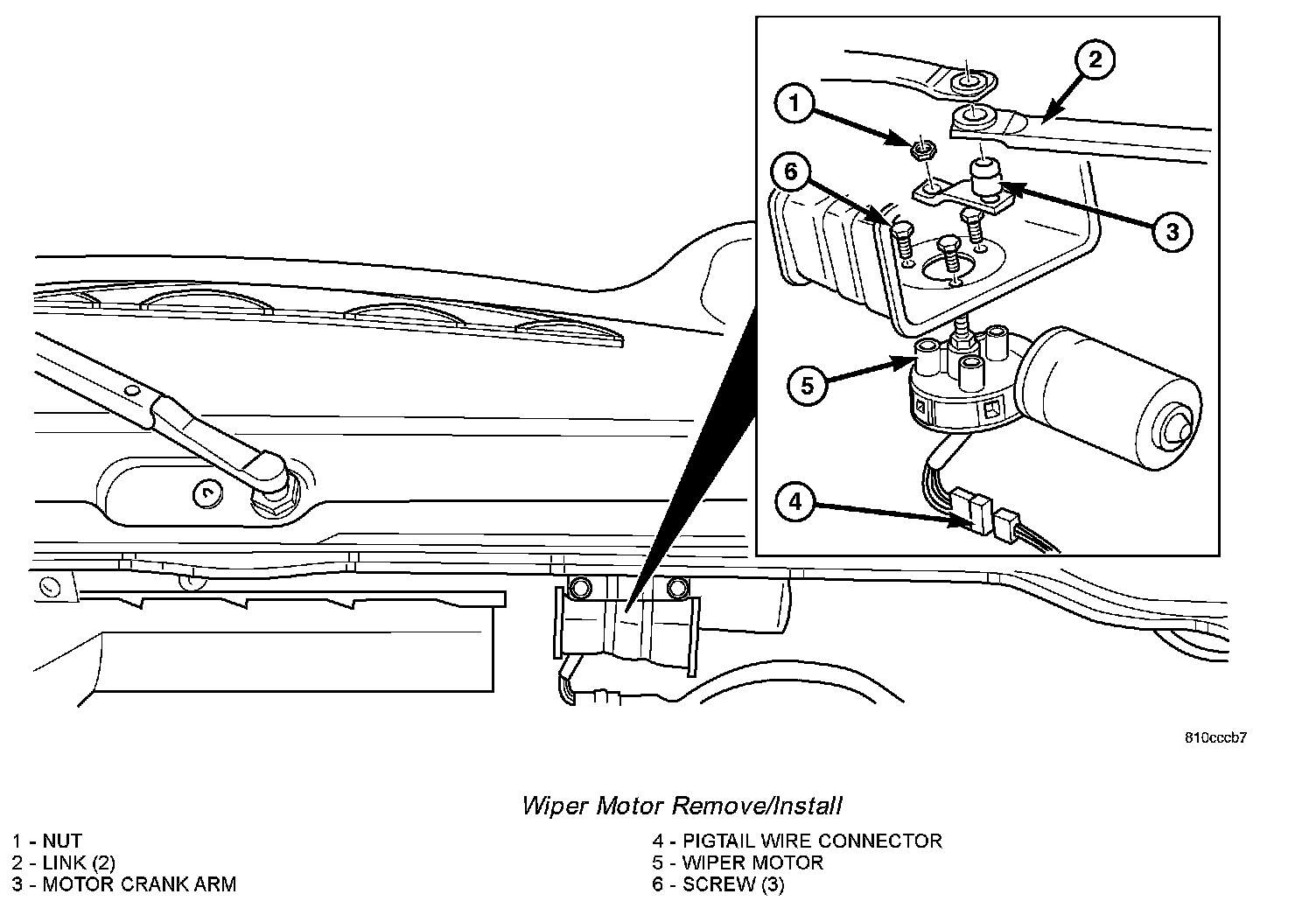 5. Disengage the motor crank arm from the wiper motor output shaft.