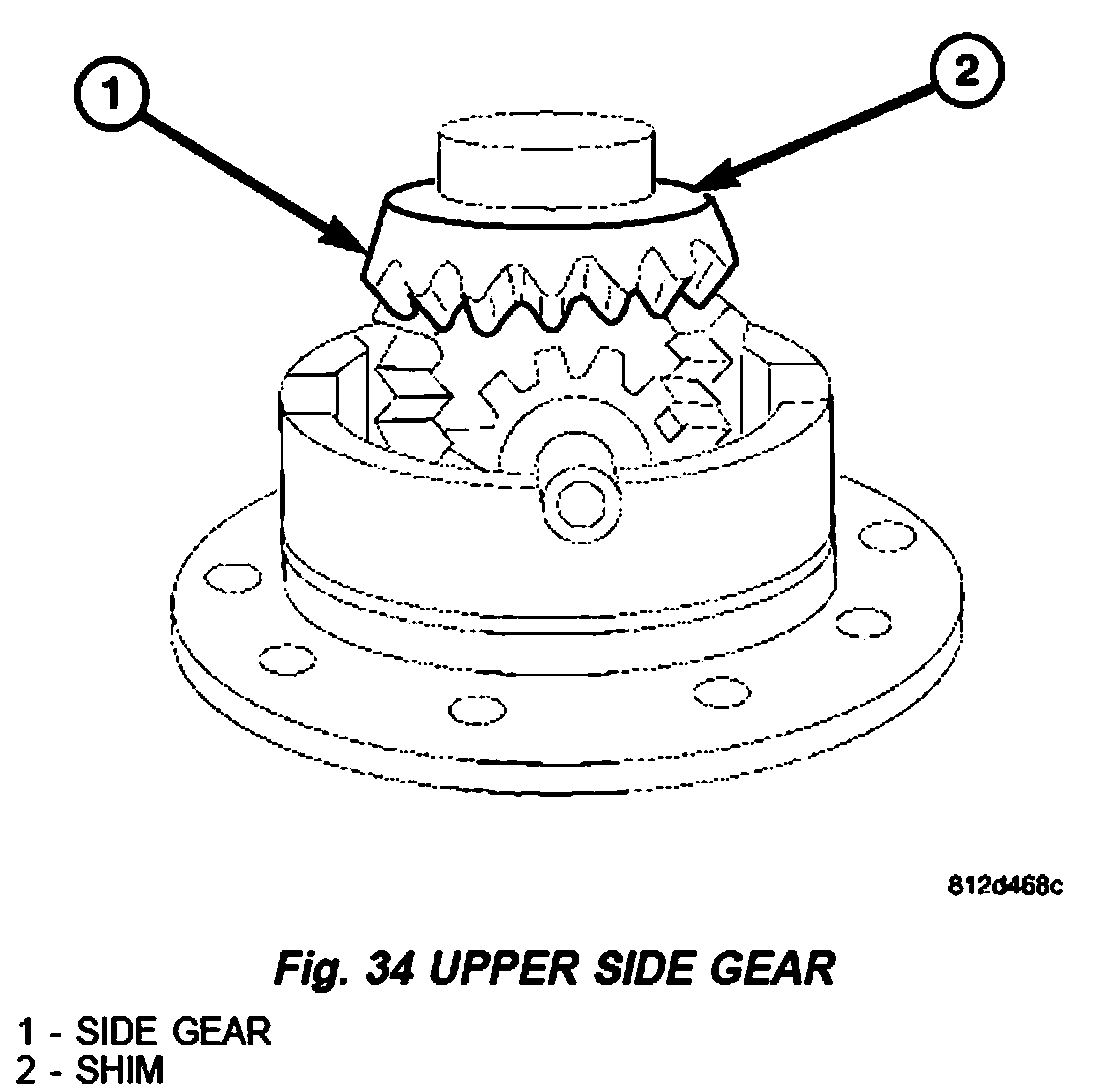 2. Remove upper differential side gear (1) and shim (2) (Fig. 34).