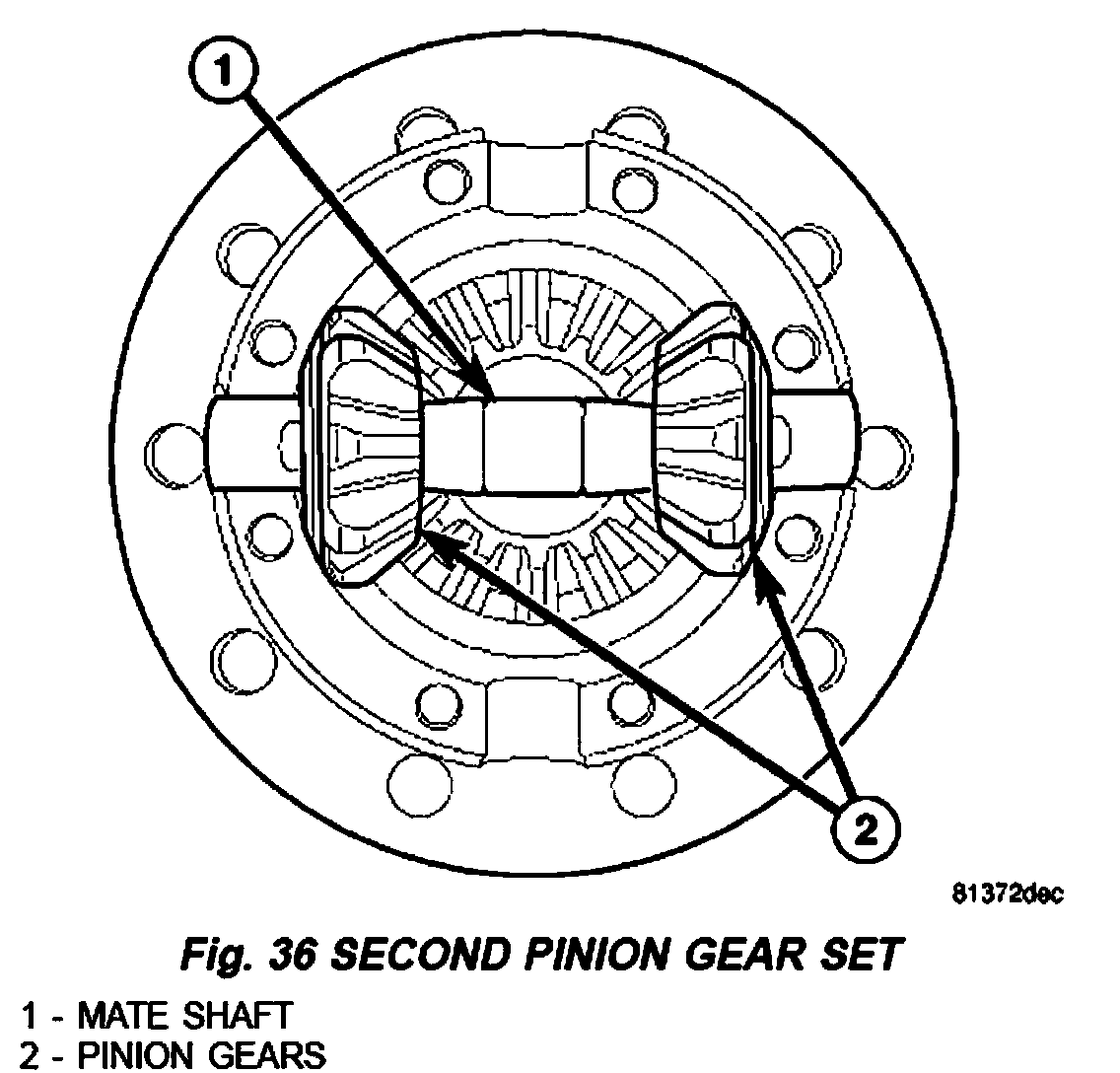 4. Remove second set of differential pinion gears (2), spherical washers and mate shaft (1) (Fig. 36).