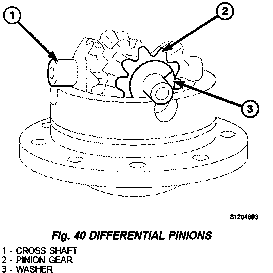 3. Remove differential cross shaft (1) with pinion gears (2) and spherical washers (3) (Fig. 40).
