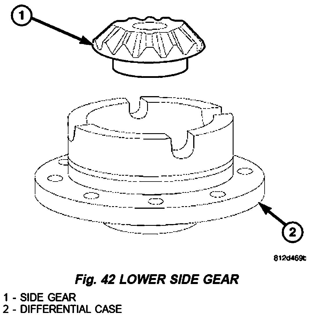 1. Install lower differential side gear (1) and shim (Fig. 42).