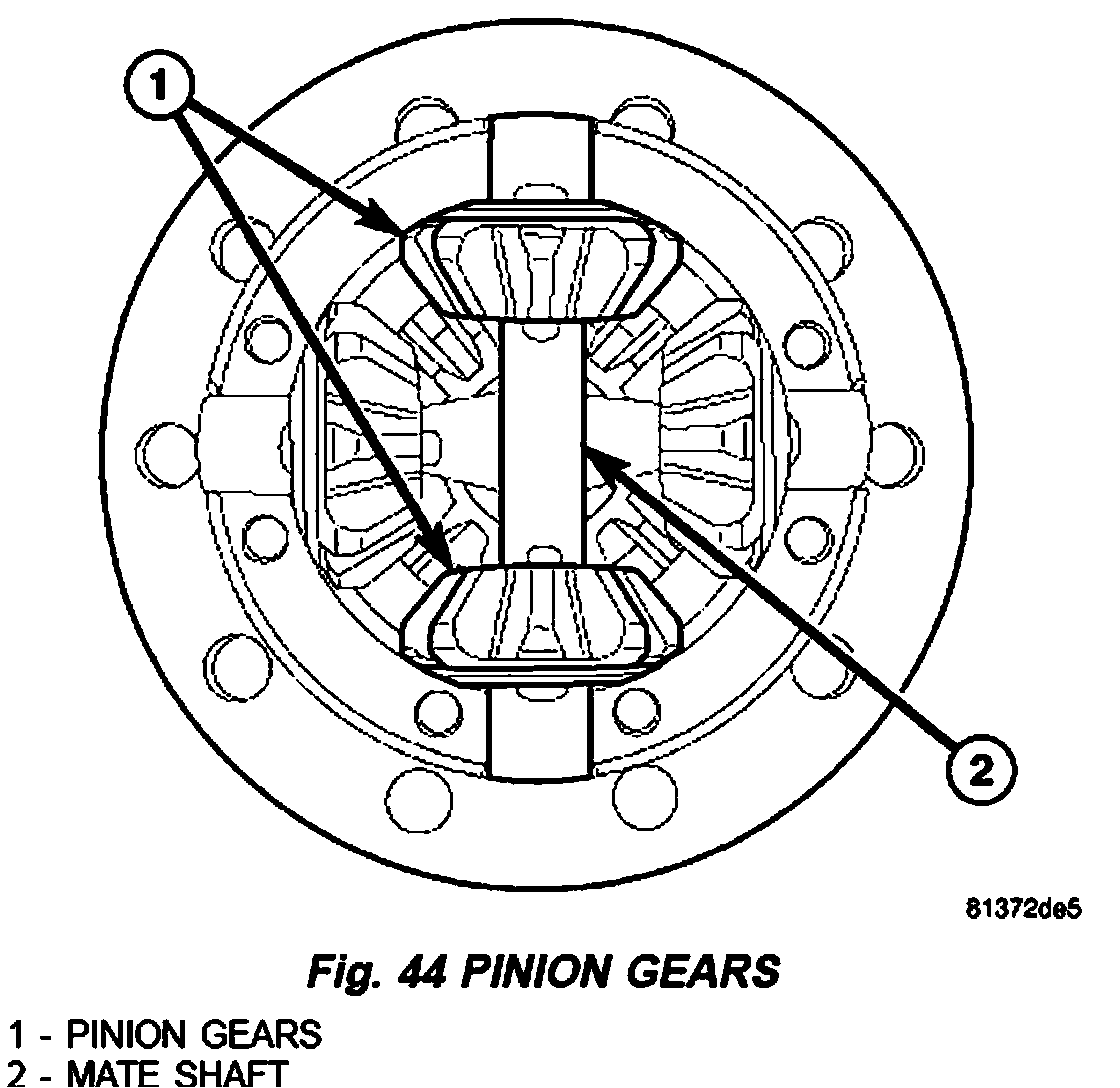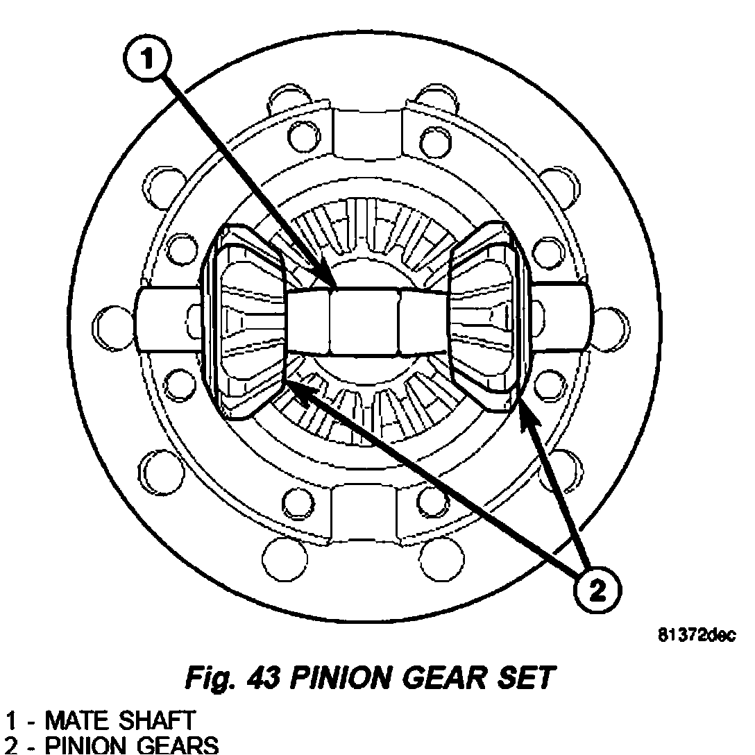 2. Install first differential pinions gears (1) with spherical washers and mate shaft (2) (Fig. 43).