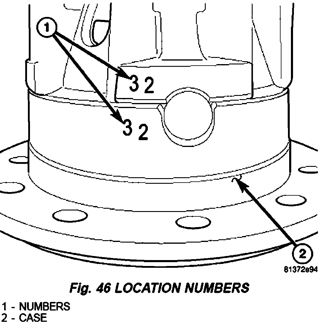 5. Install differential cover with location numbers (1) on differential case (2) aligned (Fig. 46).
