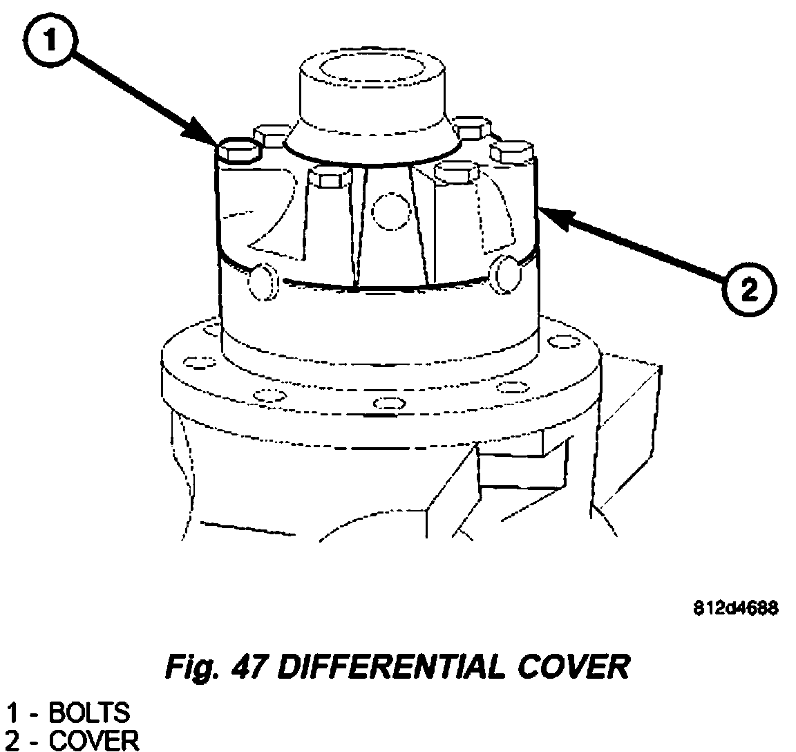 6. Install differential cover (2) bolts (1) and tighten to 45 Nm (33 ft. lbs.) (Fig. 47).