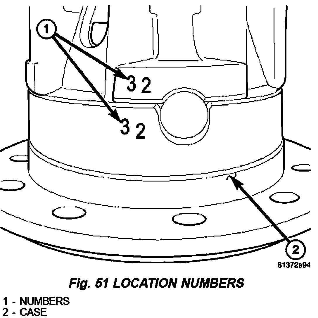 4. Install differential cover with location numbers (1) on differential case (2) aligned (Fig. 51).