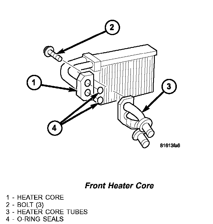 The heater core is mounted into the HVAC housing, located behind the instrument panel. The heater core is a heat exchanger made of rows of tubes and fins. The heater core tubes are attached to the heater core by using O-ring seals and bolts.
