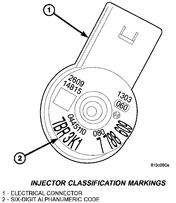 NOTE: Fuel Injectors have different flow rates. When ALL injectors are removed, re-enter all injector six digit codes.The classification of injectors into 3 classes describes the quantity characteristic of the injector. This will make it possible in the future to match the engine software to the tolerances of the injector within a more narrowly graduated range. Classification can be clearly recognized, and assigned only by means of a DRBIII(R).