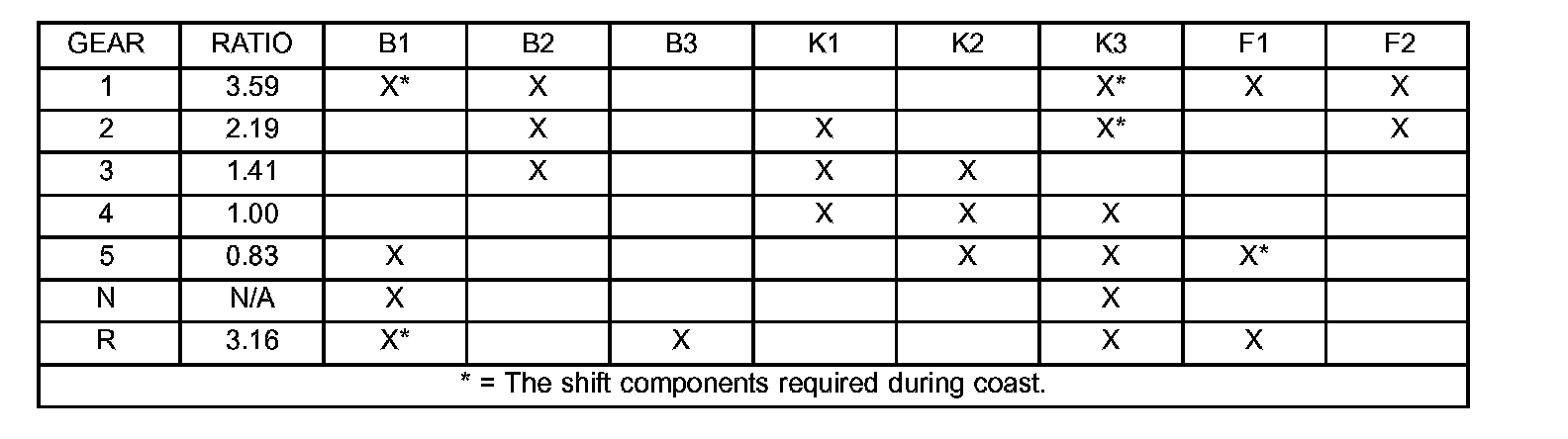Refer to CLUTCH APPLICATION for which shift elements are applied in each gear position.