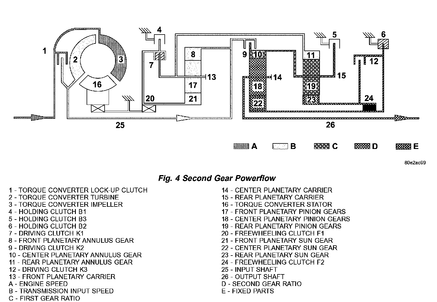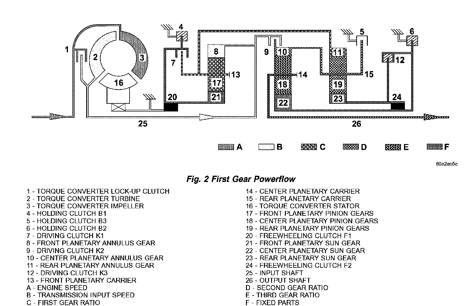 Torque from the torque converter is increased via the input shaft (25) and the center and rear planetary gearset and transferred to the output shaft (26) (Fig. 4) (Fig. 5)
