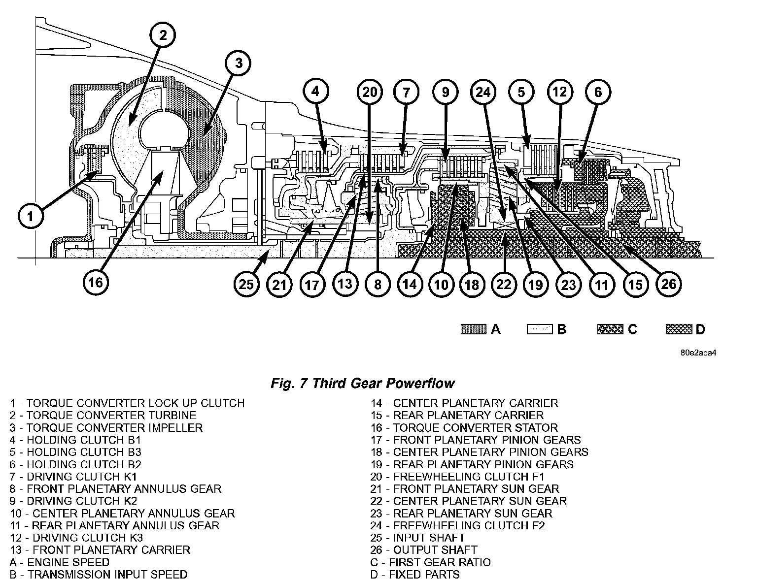 Torque from the torque converter is increased via the input shaft (25) and all three planetary gearsets and transferred to the output shaft (26). (Fig. 2) (Fig. 3)