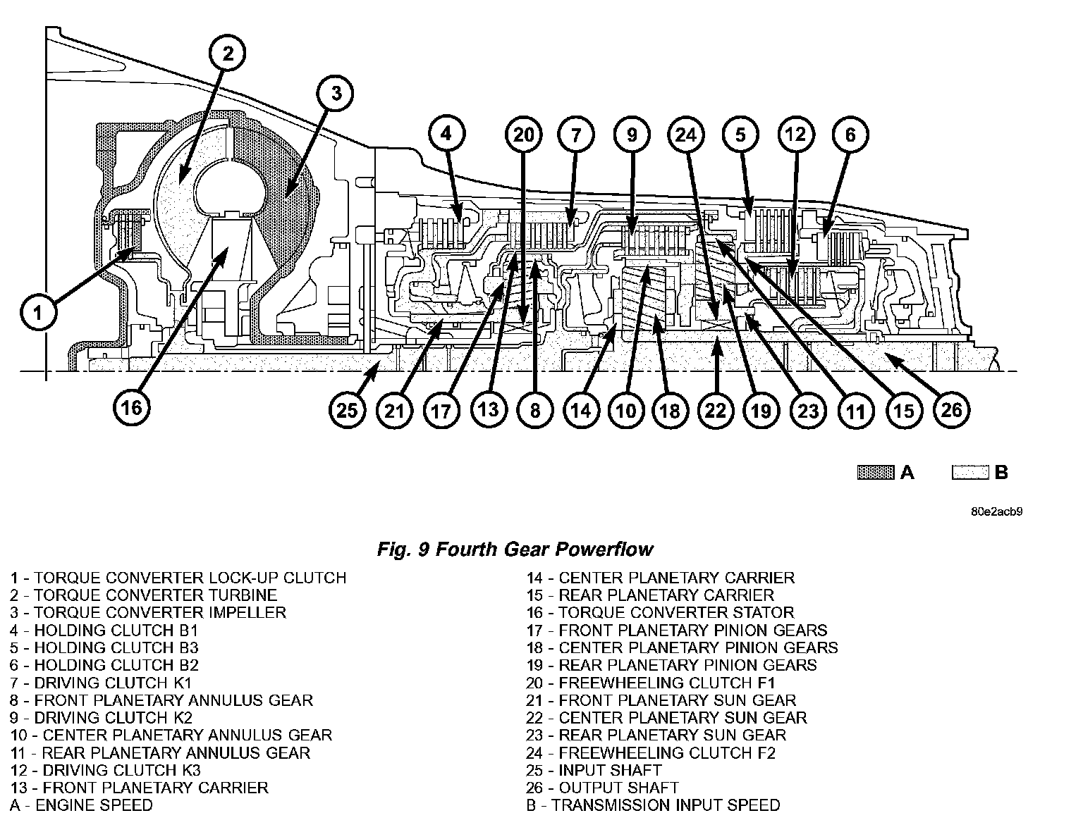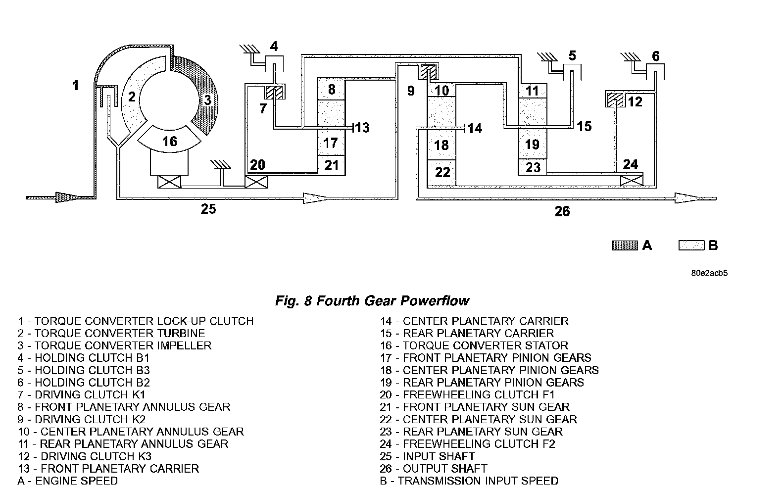 Speed and torque are not converted by the direct gear ratio of the 4th gear. Power is transferred from the input shaft (25) to the output shaft (26) via three locked planetary gearsets. (Fig. 8) (Fig. 9)