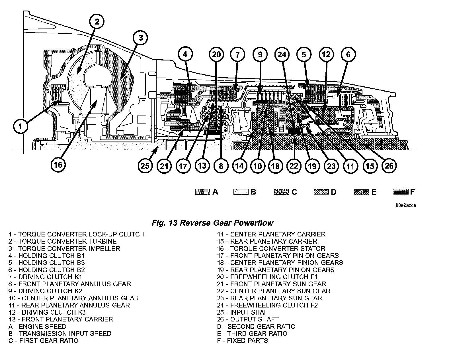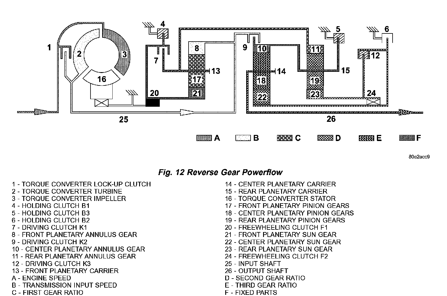 Torque from the torque converter is increased via the input shaft (25) and all three planetary gearsets and transferred with reversed direction of rotation to the output shaft (26). (Fig. 12) (Fig. 13)