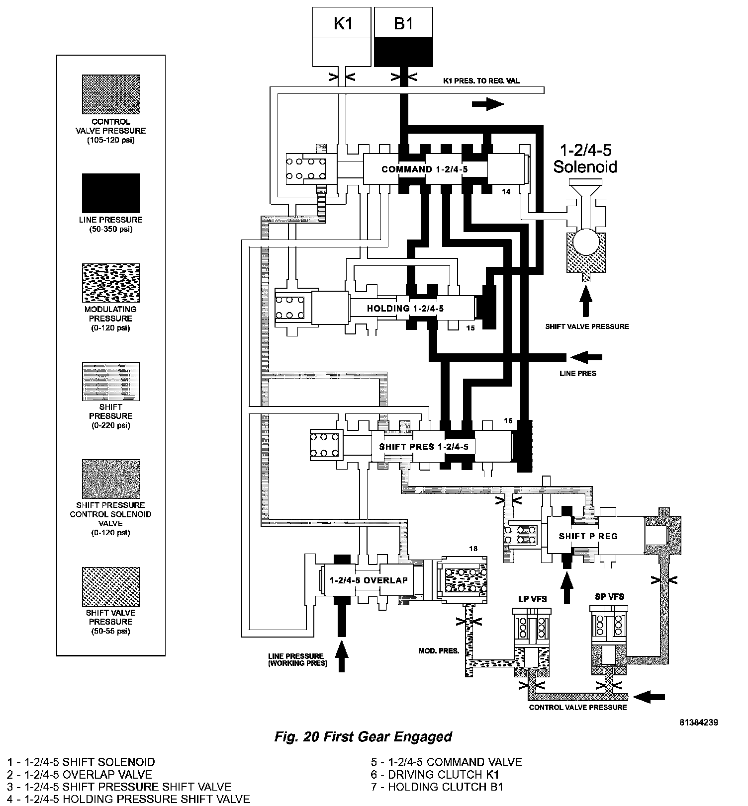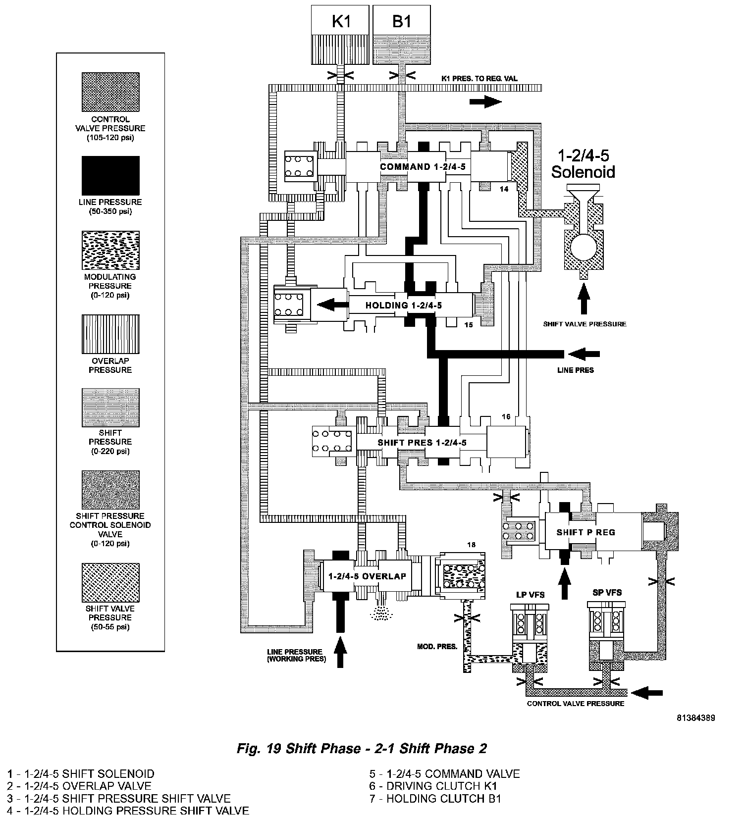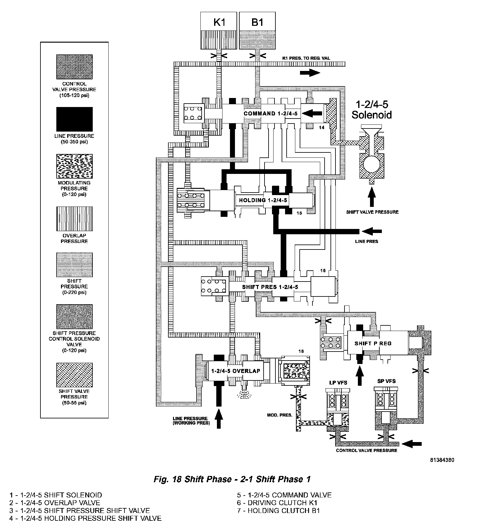 The 1-2/4 5 shift solenoid (1) (Fig. 18) is turned ON to apply shift pressure (p-S) to the end face of the 1 2/4 5 command valve (5). This allows the command valve to up shift and the shift pressure coming from the 1 2/4 5 shift valve (3) is routed to the holding clutch B1 (7) via the command valve.