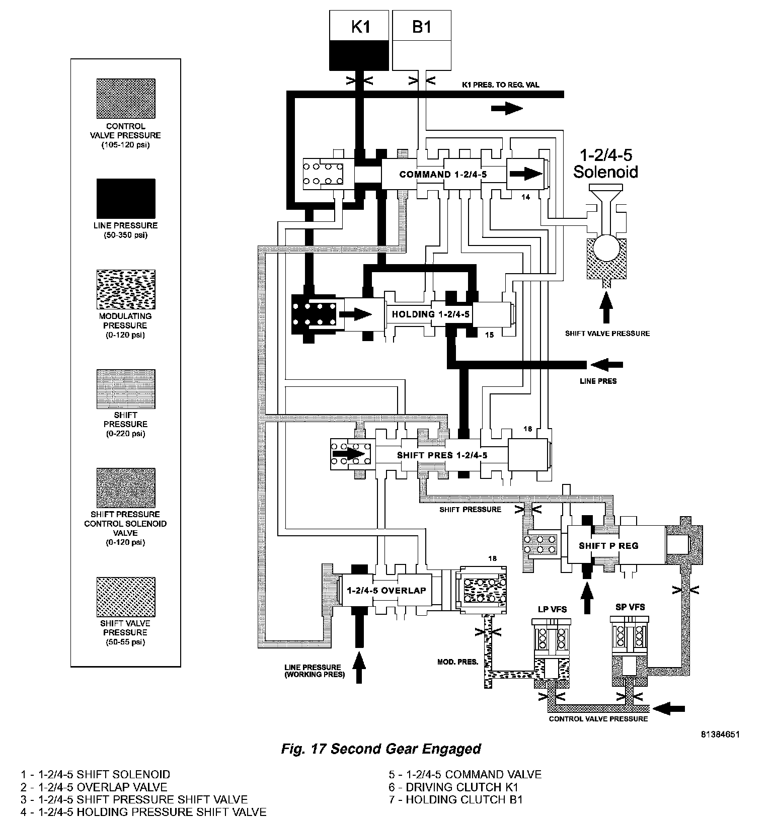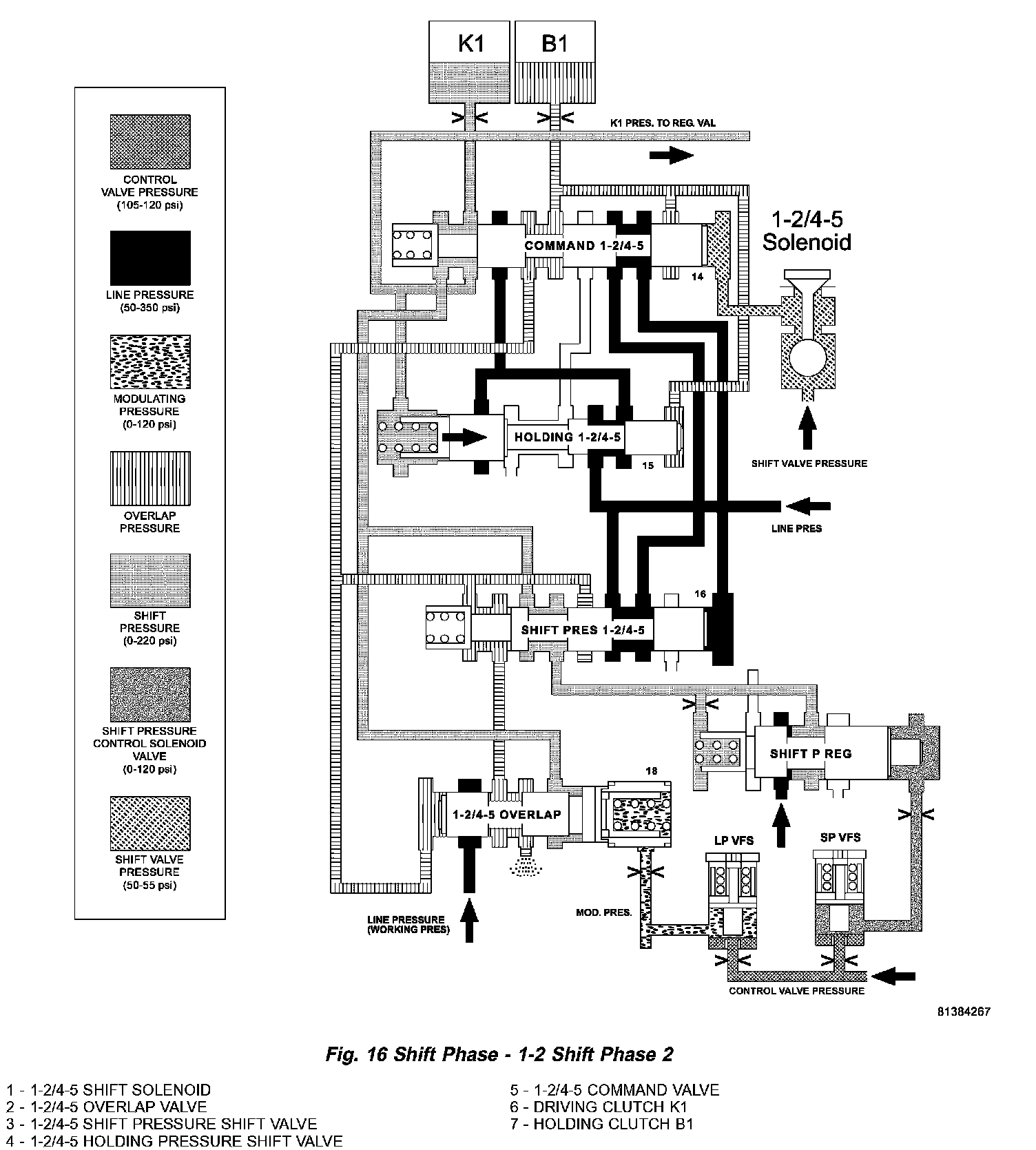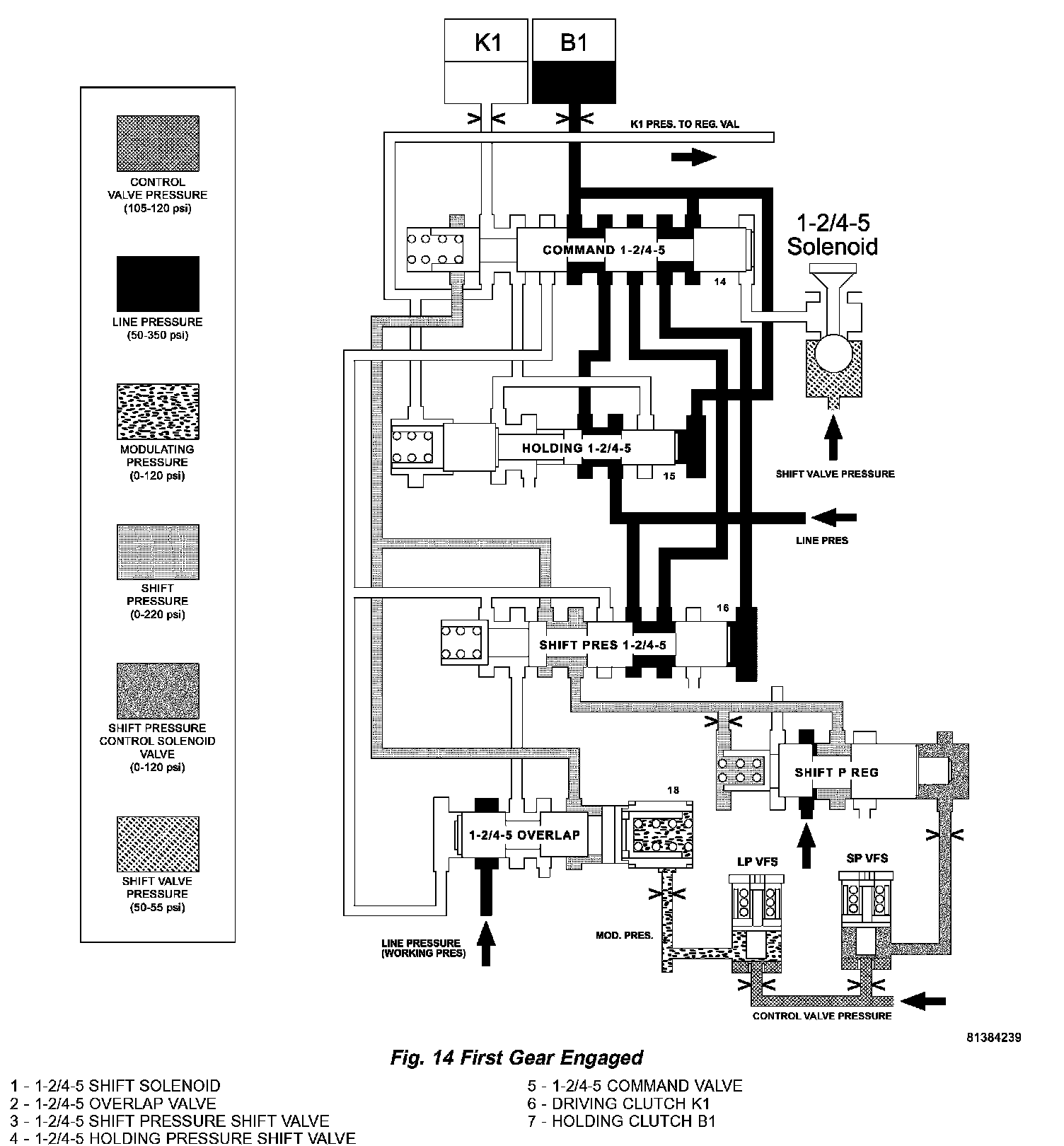 The 1-2/4 5 shift solenoid (1) (Fig. 18) is turned ON to apply shift pressure (p-S) to the end face of the 1 2/4 5 command valve (5). This allows the command valve to up shift and the shift pressure coming from the 1 2/4 5 shift valve (3) is routed to the holding clutch B1 (7) via the command valve.