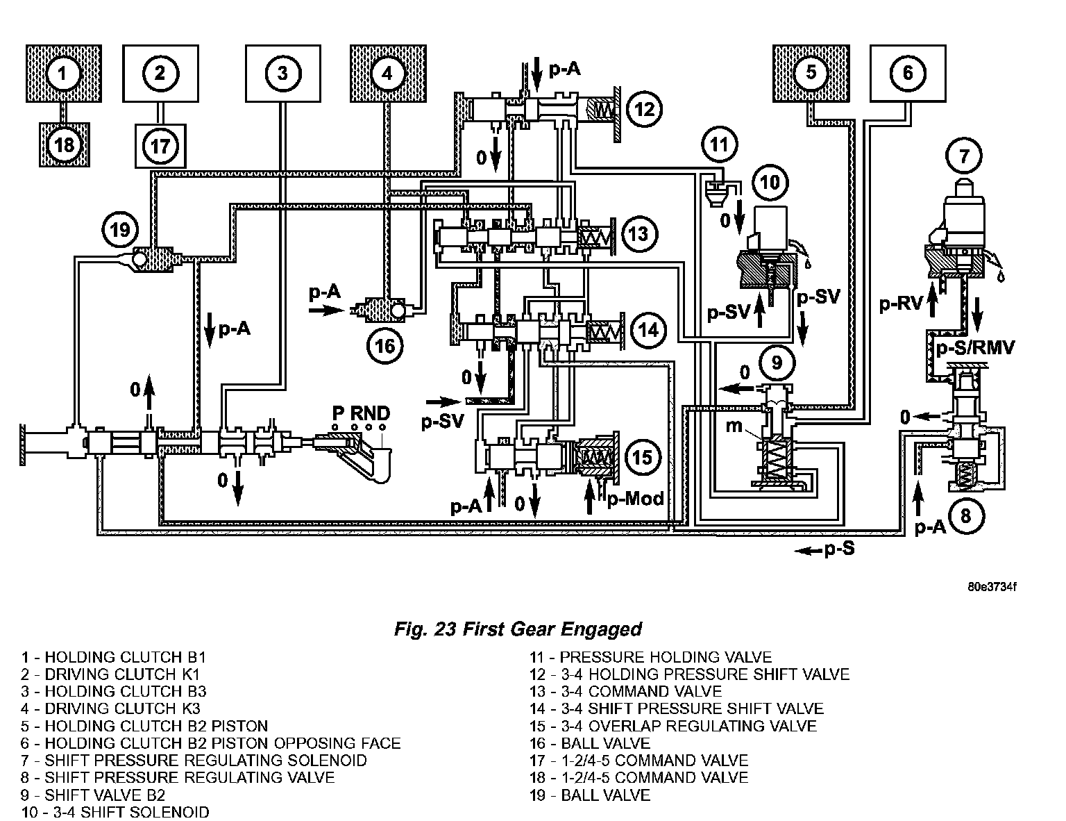 The pressure in clutch B1 (7) (Fig. 19) acting on the end face of the 1 2/4 5 holding valve (4) forces the valve to up shift against the spring pressure and allows line pressure (p-A) to pass through the command valve (5).
