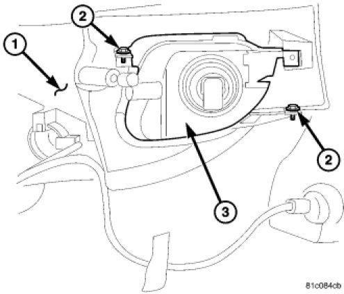 3. From the back of the front bumper (1), remove the two screws (2) that secure the front fog lamp (3) to the bumper.