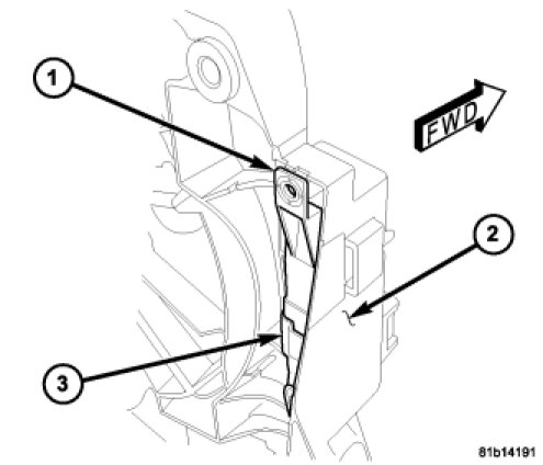 1. Position the condenser fan relay (1) to the condenser fan shroud (2) and connect the wire harness connector (3).