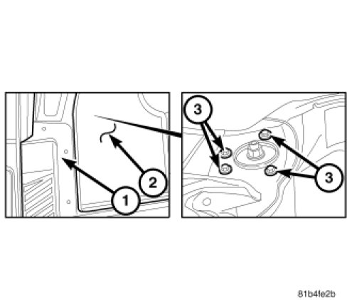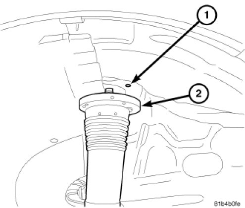 9. Install the strut (2) into the upper strut hole (1) rear half of the wheel well liner.