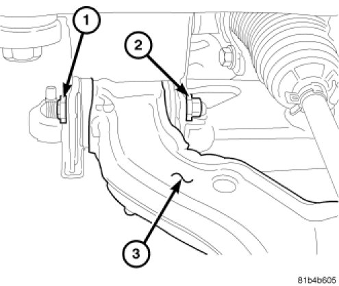 1. Install the lower control arm (3) to the frame. Hand tighten the nuts (1) and bolts (2).