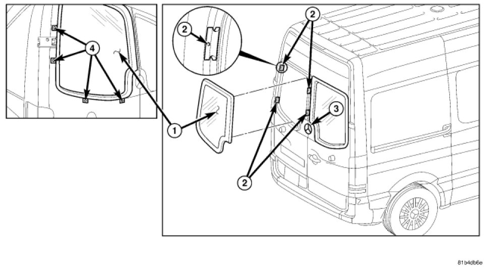 NOTE: Do not press on rear window (1) too firmly. Open sliding door so that rear window (1) is not pressed toward outside by air pressure when the rear door is closed.