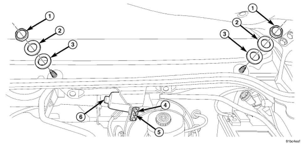 5. Remove the nut (1), washer (2) and rubber pad (3) that secures each wiper pivot housing to the outside of the cowl top panel.