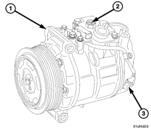 This A/C system uses a Denso 7SEU17C clutchless, variable displacement, swashplate type A/C compressor (1). This A/C compressor has a high pressure relief valve (2) located on the manifold at the top of the compressor, and a control valve (3) located on side of the back cover. The A/C compressor is secured with three bolts to the left front of the engine.