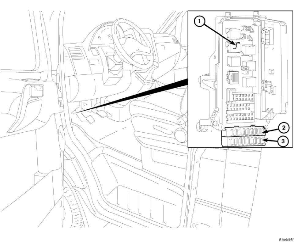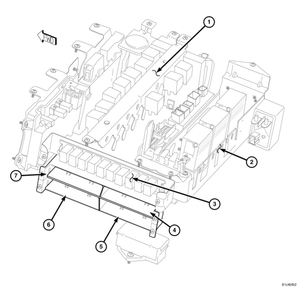 The Fuse/Relay Block #1 (also known as the SRB) (1) is located beneath the driver side end of the instrument panel in the passenger compartment. The SRB is the location for all standard fuses and relays and acts as the junction block for several of the vehicles wiring harnesses. Fuse Block #1 (3) and Fuse Block #2 (2) are both attached to the bottom of the SRB by a bracket. The Body Control Module (BCM) (also known as the Signal Acquisition and Actuation Module/SAM), is directly plugged into the right side of the SRB.