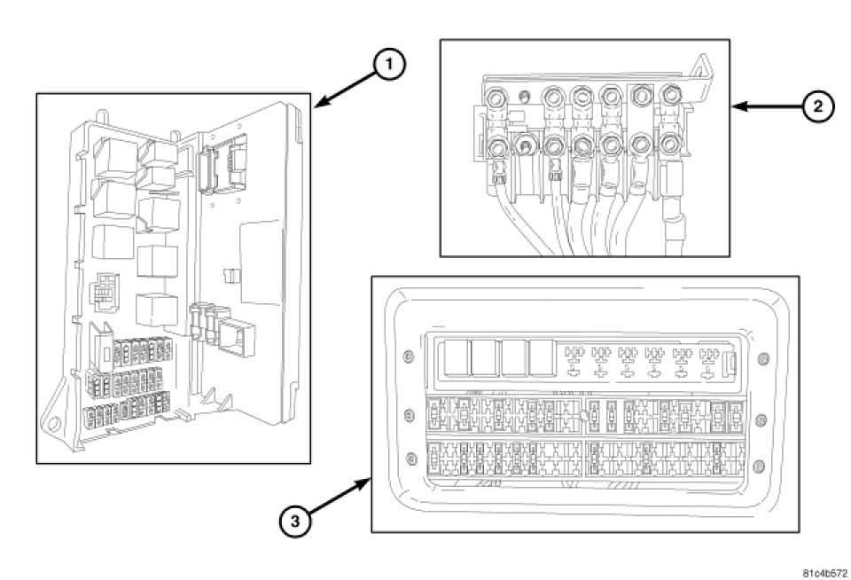 The Power Distribution center (PDC) is attached to a stud (8) on the positive battery clamp of the starter battery. The PDC contains six bolt-on MIDI fuses which protect components such as glow plugs, double auxiliary cooling fans and provide additional protection to the feed circuits that power the fuse/relay boxes. The PDC contains MIDI fuses for the following systems: