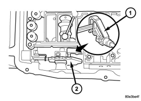 2. Insert selector valve (1) in driver of detent plate (2). When installing the electrohydraulic control module in the transmission housing, the plastic part of the selector valve (1) must engage in the driver of the detent plate (2).