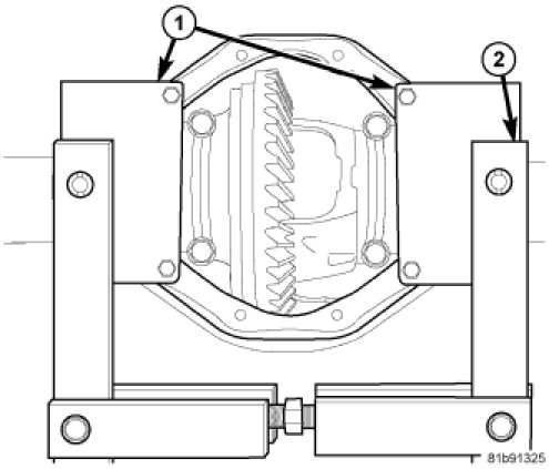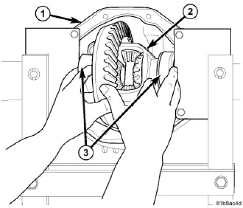2. Install differential case (2) into the housing (1) with bearings, cups (3) and shims.