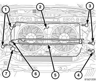 5. Carefully position the A/C condenser fan assembly (2) into the front of the engine compartment.