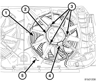 6. Install the four bolts (1 and 3) that secure the A/C condenser fan assembly to the radiator. Tighten the bolts securely.