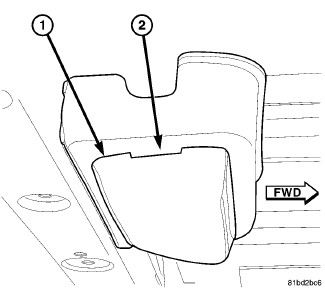 2. Insert the tip of a trim stick or a similar wide flat-bladed tool into the notch (2) on one edge of the motion detector lens (1) and carefully pry the unit downward until it unsnaps from the mounting bracket or the headliner, as the vehicle is equipped.