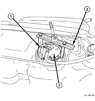 7. Twist rod (3) slightly to remove from fuel level sensor. Do not allow float assembly to fall into fuel tank.