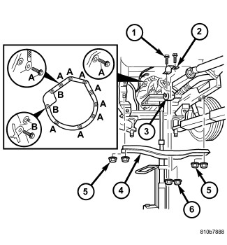 7. Move the transmission into position on the dowel pins and install two bolts (A, B) on the top of the transmission. Torque the bolts to 38 Nm (28 ft.lbs.).