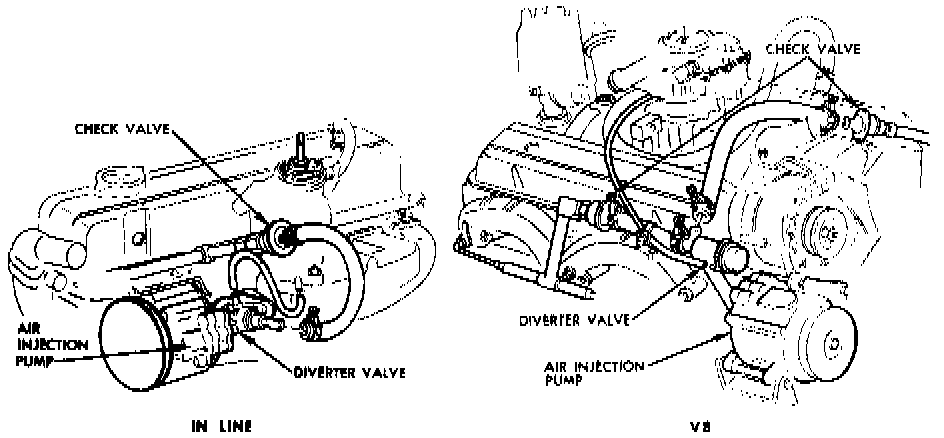 Air pump systems used--Figs 1 and 2--consist of a belt driven air injection pump--Figs 3, 4 and 5--air injection tubes (one for each cylinder), an air bypass valve, a mixture control valve 1966-67 models or diverter valve 1968-82 models, a differential vacuum delay valve, a separator valve, a vacuum differential valve (California only) and check valves (one for In-Line engines, two for V8's).
