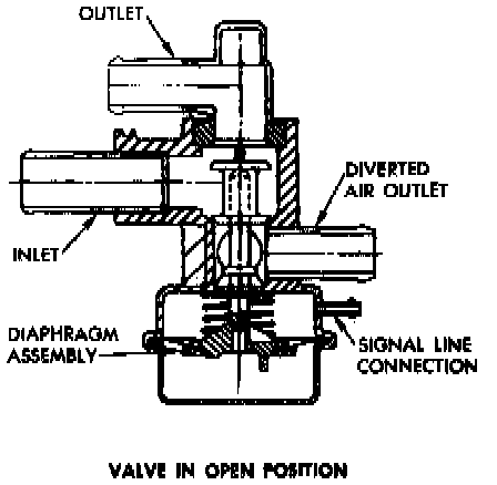 The diverter or air bypass valve--Figs 7 and 8--when triggered by a sharp increase in manifold vacuum, shuts off injected air to the exhaust preventing backfiring during this richer period.