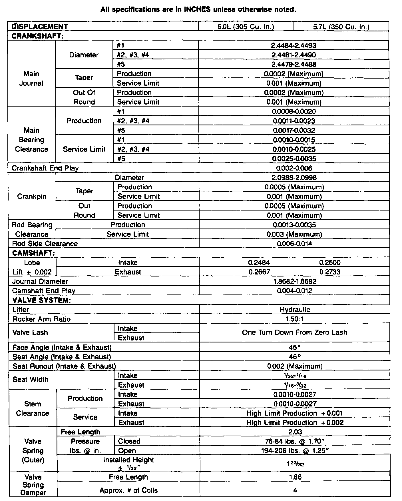 Engine Specifications (INCHES):