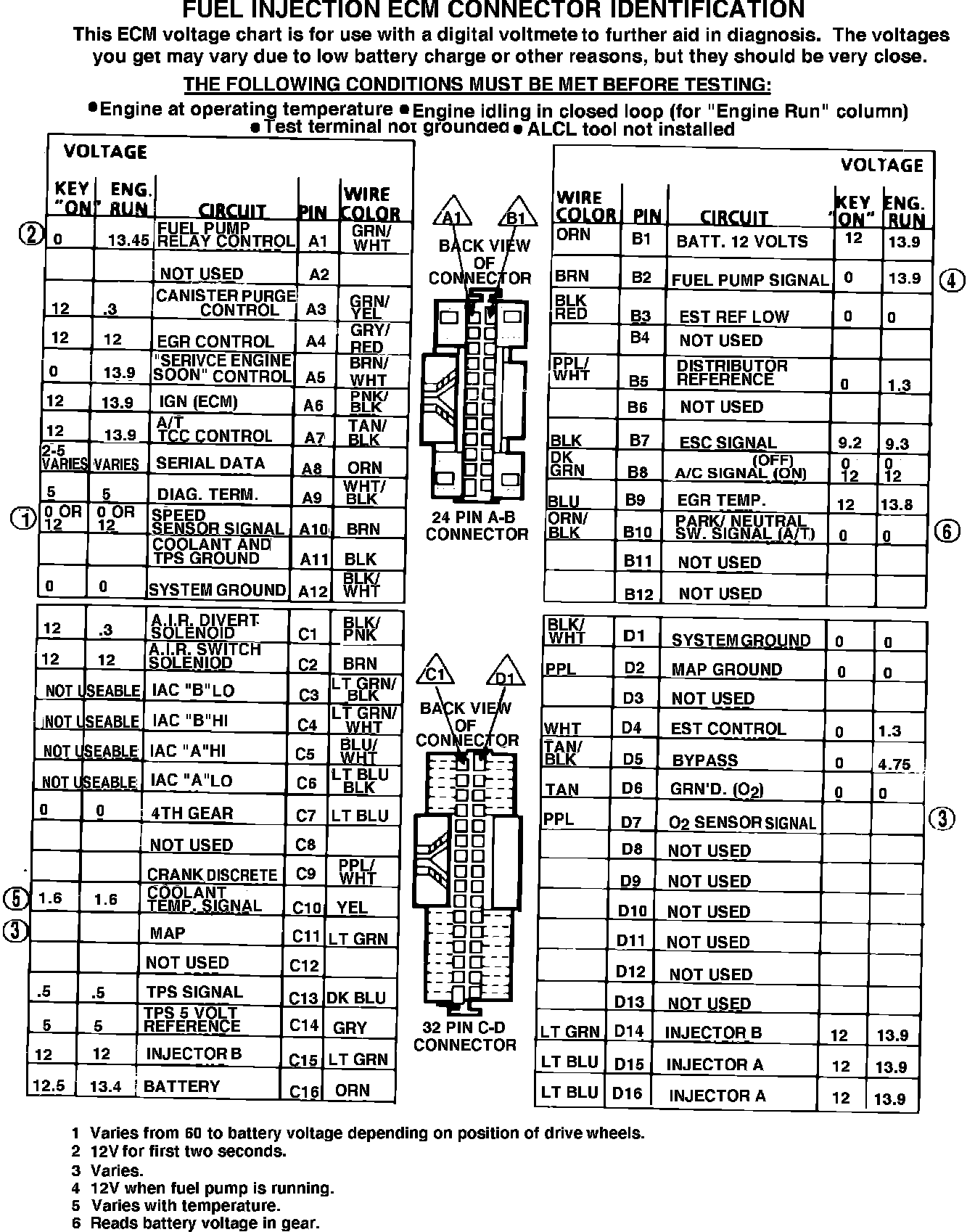 ECM Connector Terminal Identification & Voltage Specifications.:
