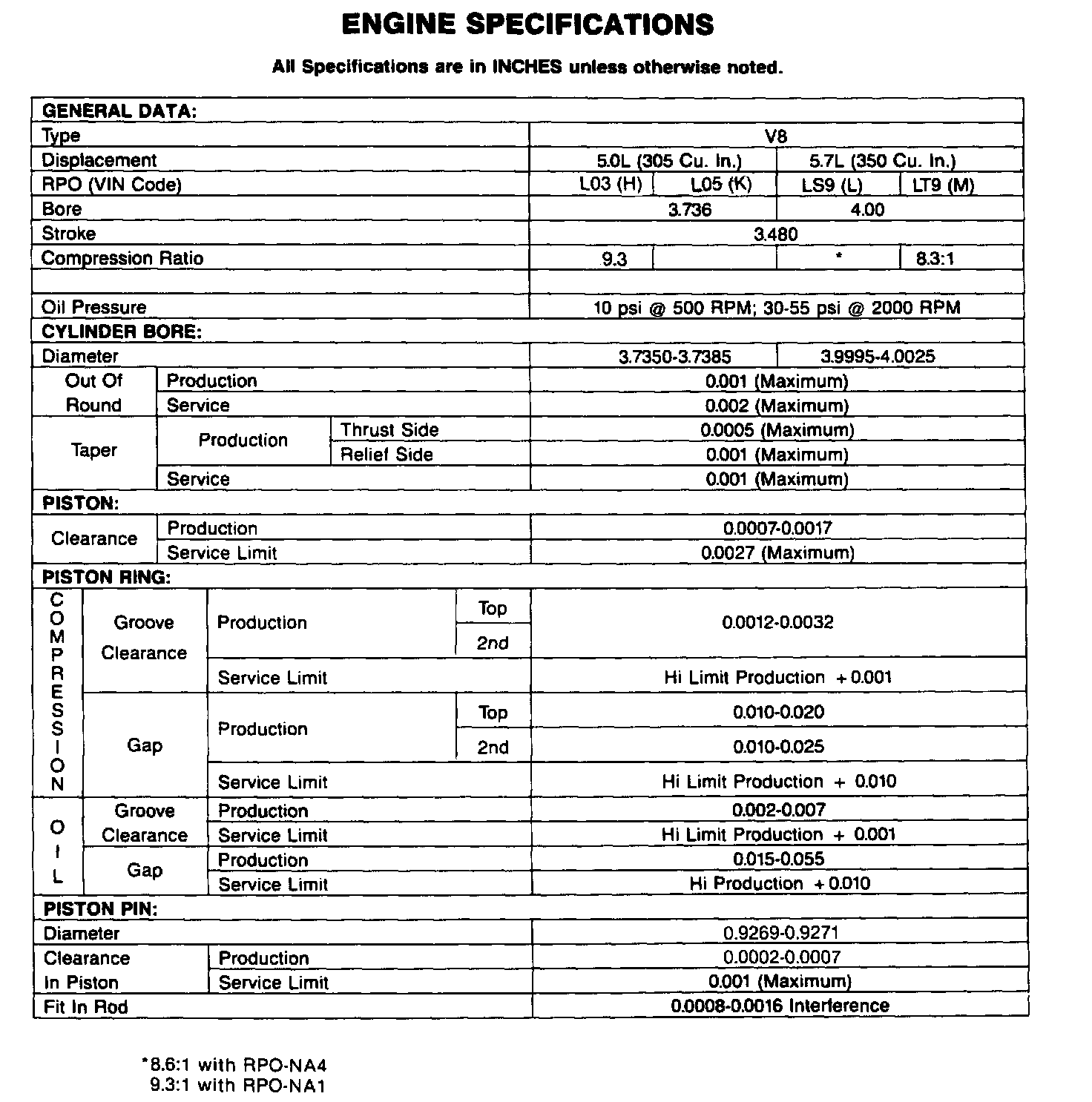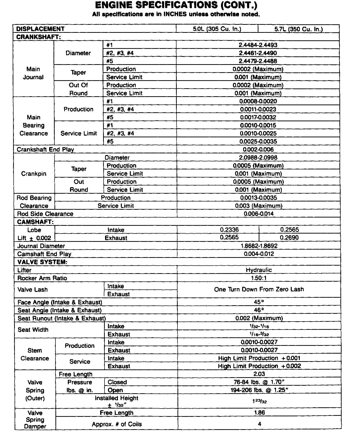 Continued Engine Specifications: