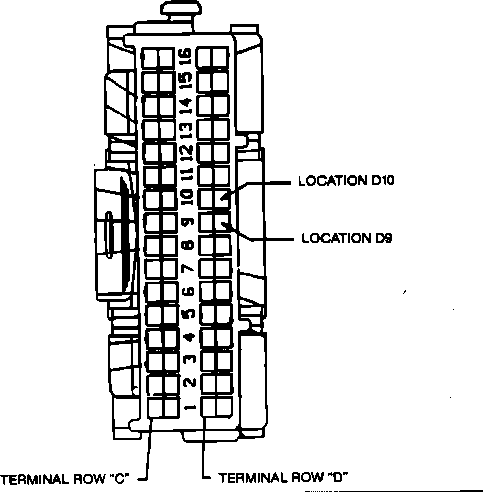 a. Locate the 151 Jumper wire terminals (.80 gage black) that are side by side in cavities D-9 and D-10 in the center of the 32-way ECM connector (with gray secondary locks), Figure No. 1A.