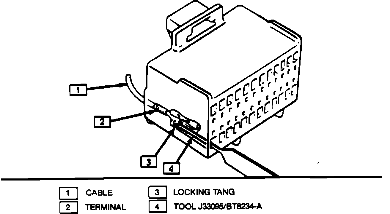 A jumper wire will be furnished "no charge" for each vehicle by GMC Truck Division. Parts will be shipped directly to the involved dealers. Use the following instructions to install the new jumper wire. In order to remove micro-pack terminals from the connector, a terminal removal tool will be required to perform this repair. Proper tool is Kent-Moore J-33095 or Burroughs BT-8234-A.