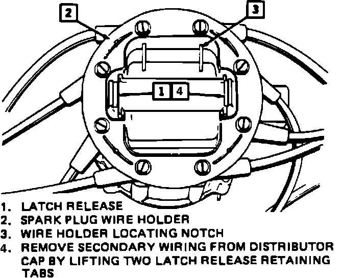 2. Remove the distributor cap by turning four latches counterclockwise. Move cap out of the way.