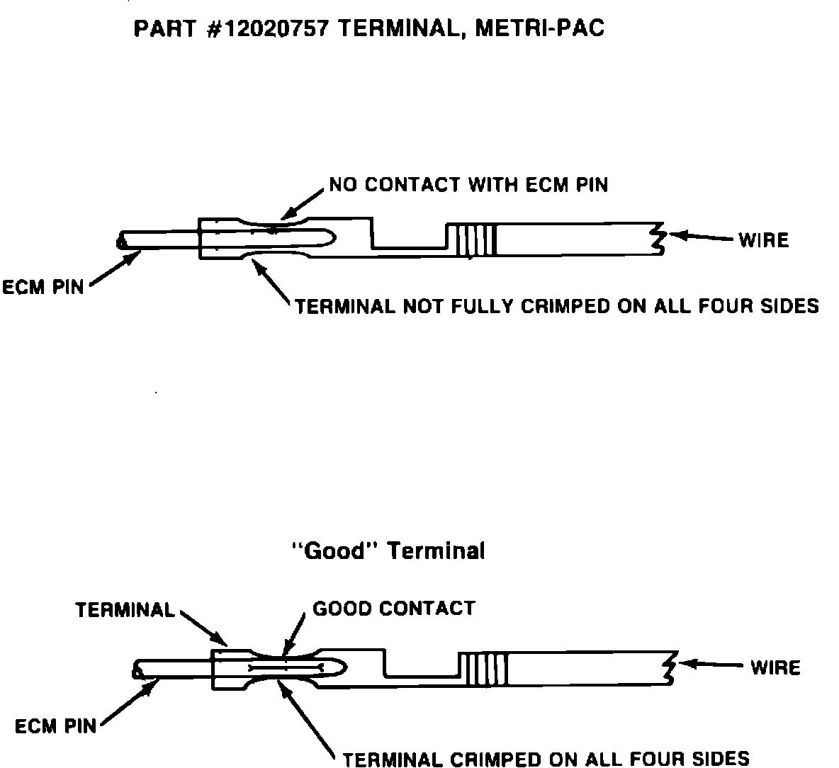 If this condition exists, visually inspect the terminal using a flashlight, or use a .95 mm pin gage. The gage should not pass freely through the female terminal. Do not probe the terminal with anything other than the pin gage, as probing could damage the terminal. If the female terminal does not grip properly, replace the terminal with P/N 12020757. General directions on wiring repair are shown on page 3-92 thru 3-94 of the 1988 Driveability and Emissions Manual X-8836.