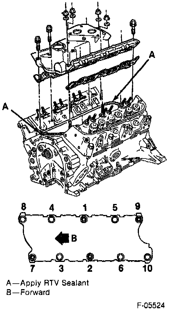 1. RTV to the front and rear sealing surfaces on the block. Apply a 5 mm (3/16-inch) bead of RTV (part number 1052917 or equivalent) to the front and rear of the block as shown.