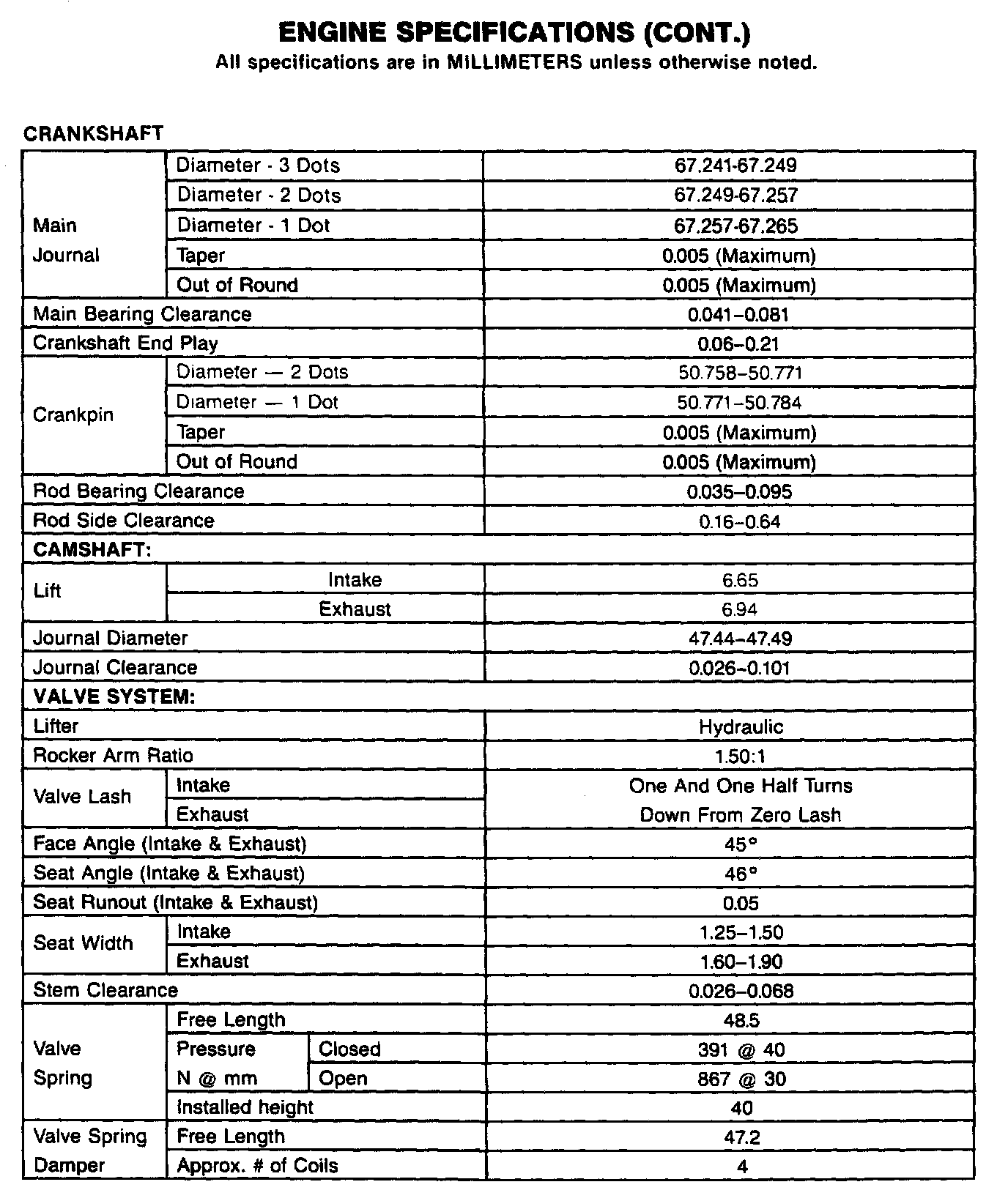 Continued Engine Specifications: