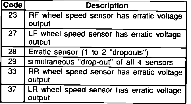 In the event a problem is experienced with the input of speed signal from the wheel speed sensors any of the following codes may be set: